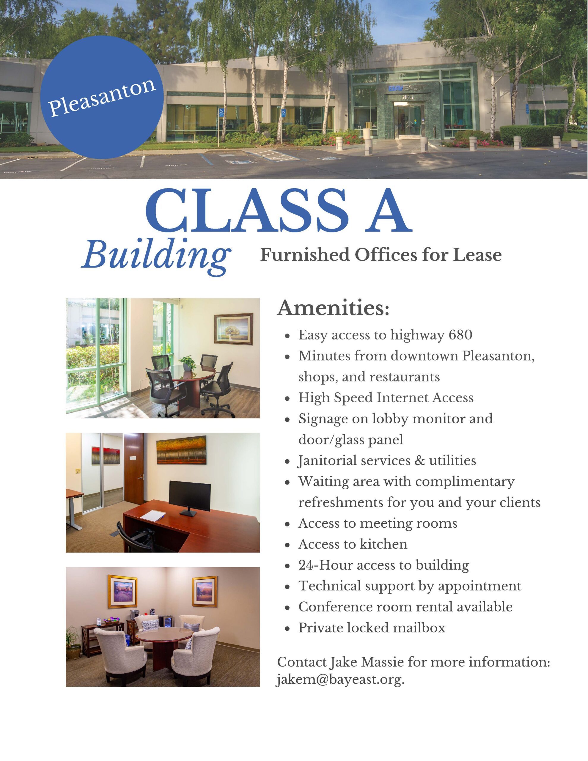 Bay East has beautiful furnished private offices available for lease at 7021 Koll Center Parkway in Pleasanton.  Amenities include: